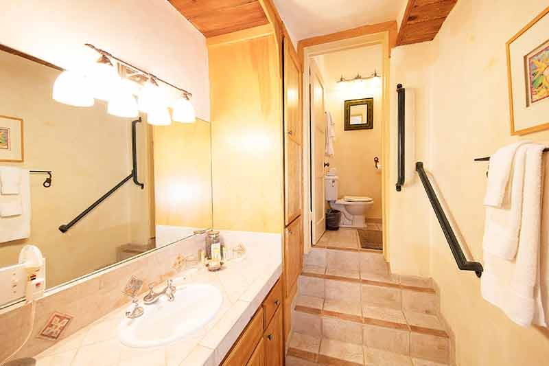 • Bath with vanity & hair dryer, steps leading to an upper level lavatory and shower.