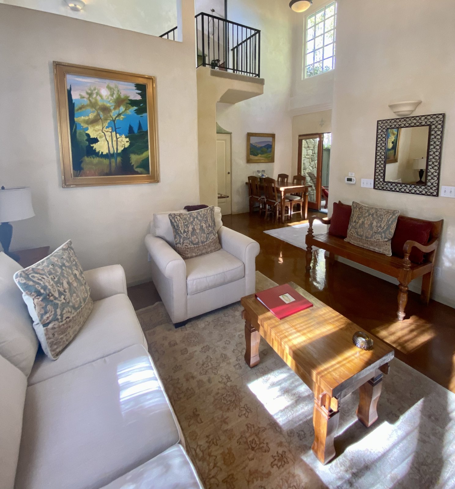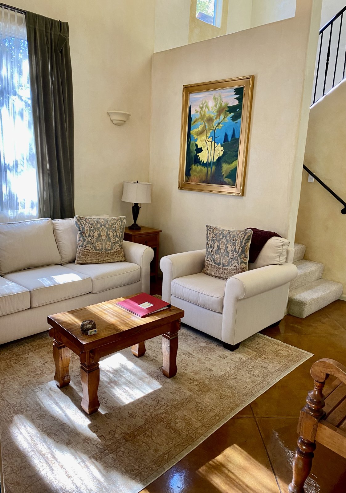 This incredible 2-story suite suite features high vaulted ceilings and is perfect for any special getaway. Relax downstairs in a cozy living room with velvet curtains and overstuffed sofas or “dine in” with a full kitchen and dining table or sunbathe on the spacious private patio. Upstairs is the bright bedroom with two private balconies, one on either side to enjoy either pool or mountain views. A sink vanity is open to the room and the private washroom features a spacious shower/bathtub combo.