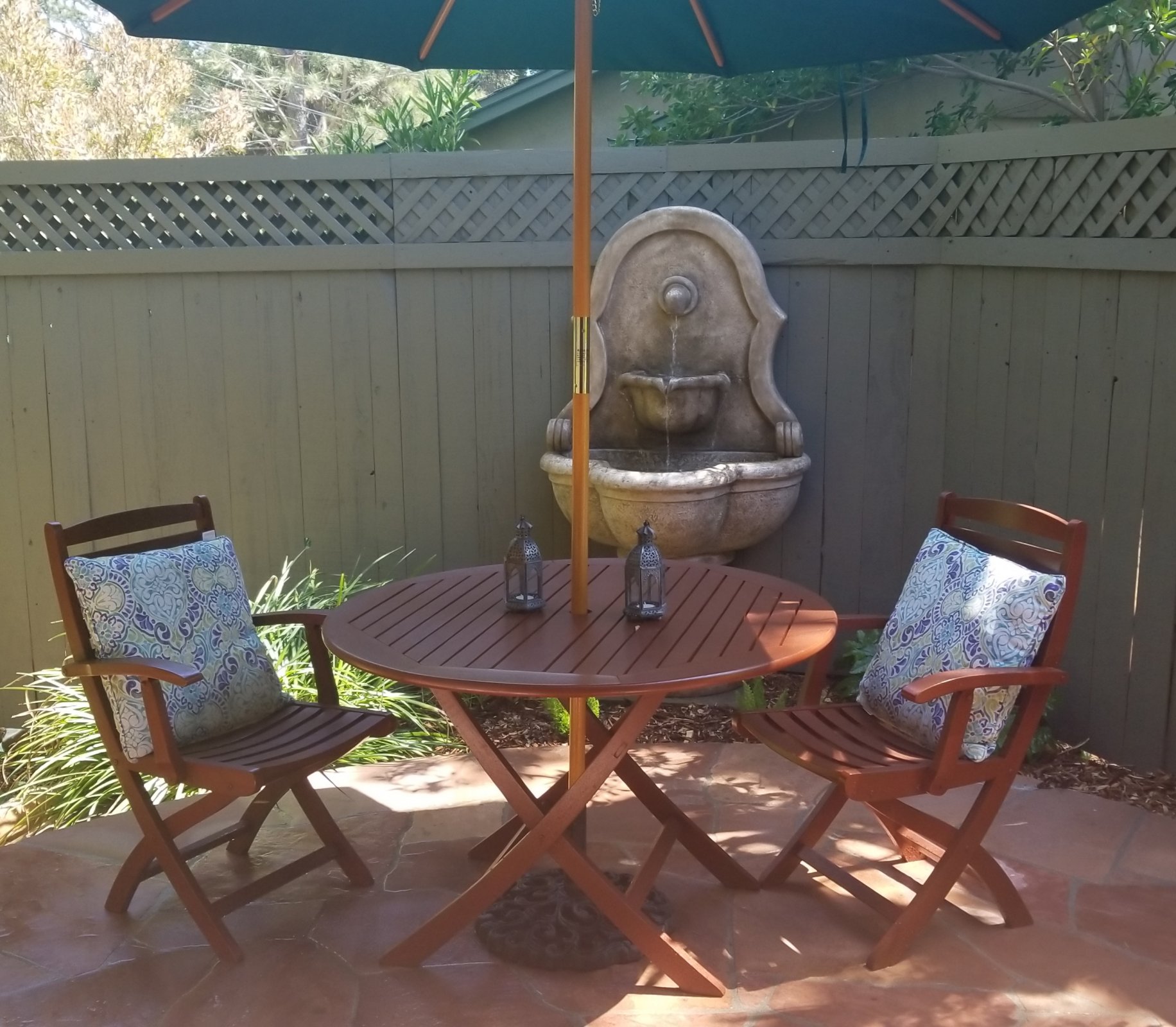 • Private outdoor garden patio area featuring a bubbling fountain