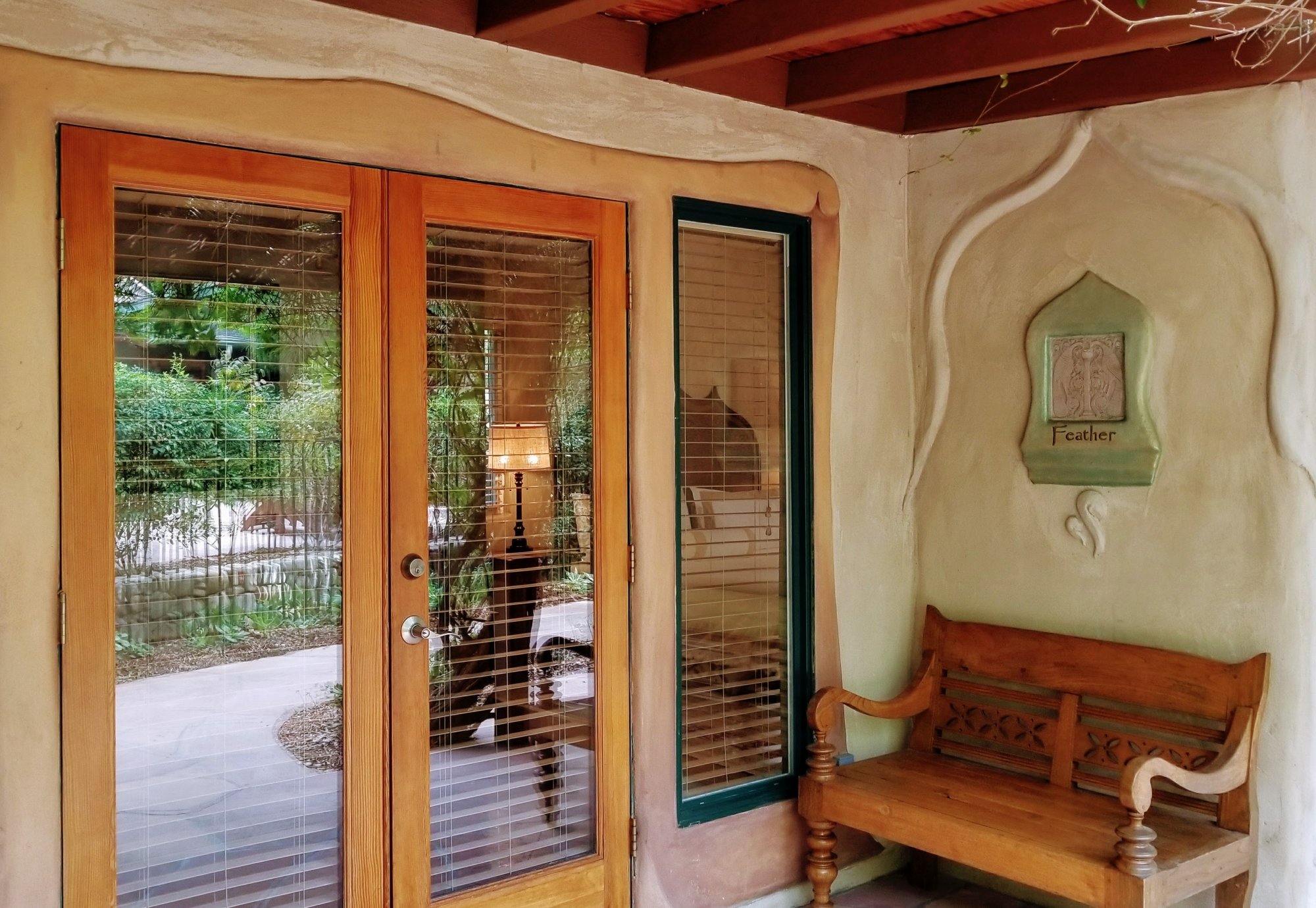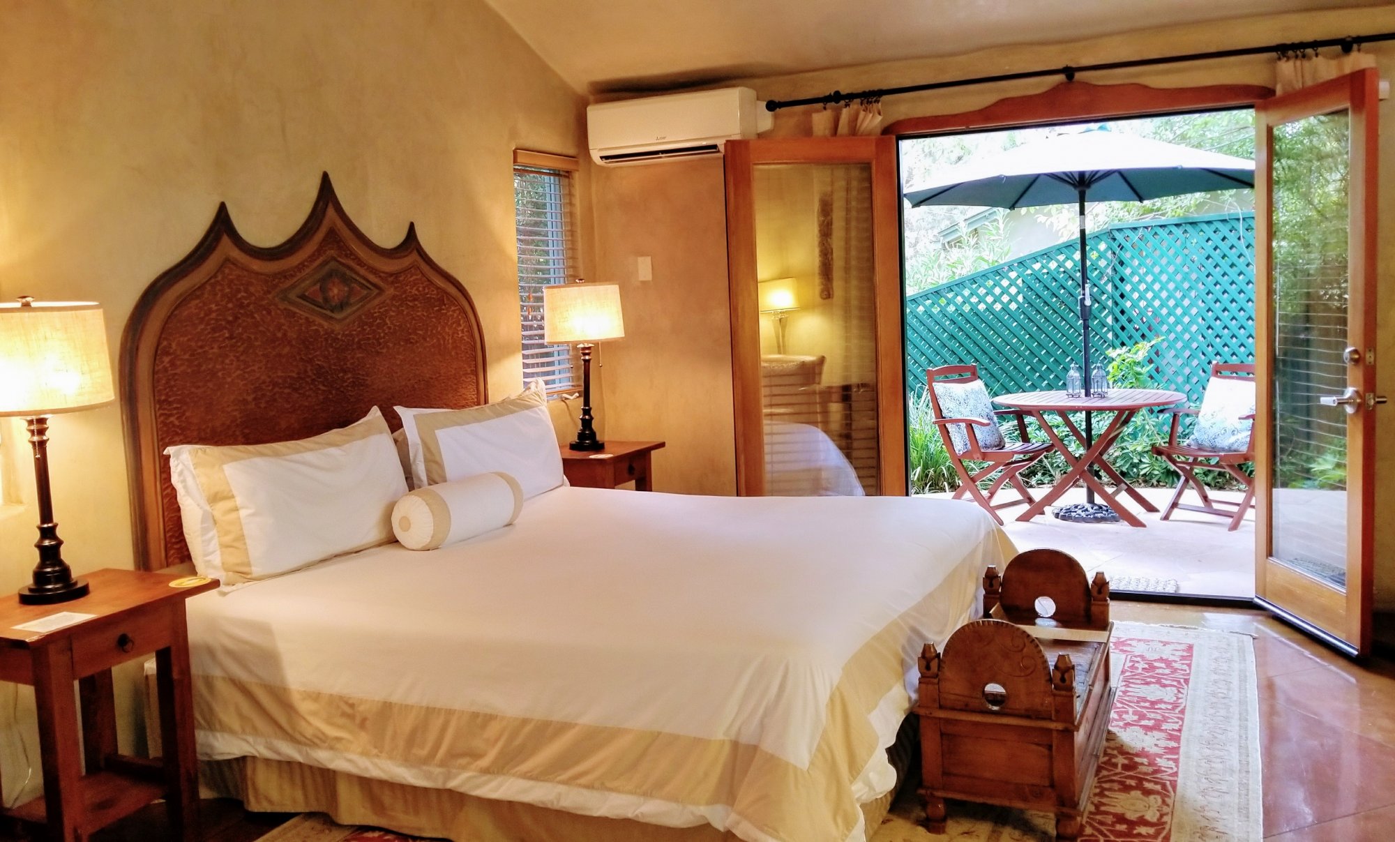 This exquisite patio guest room is a romantic treasure. The spacious and bright bath is adorned with custom handmade tiles and a double vanity. The bedroom features generous skylights, a c gas fireplace embellished with custom tile designed by Ojai’s famous RTK Studios and French doors that open to a private garden patio featuring a bubbling fountain.