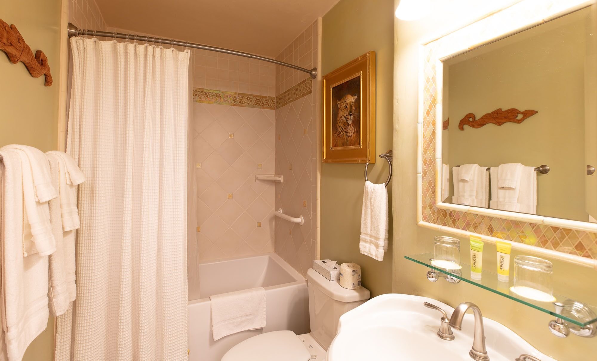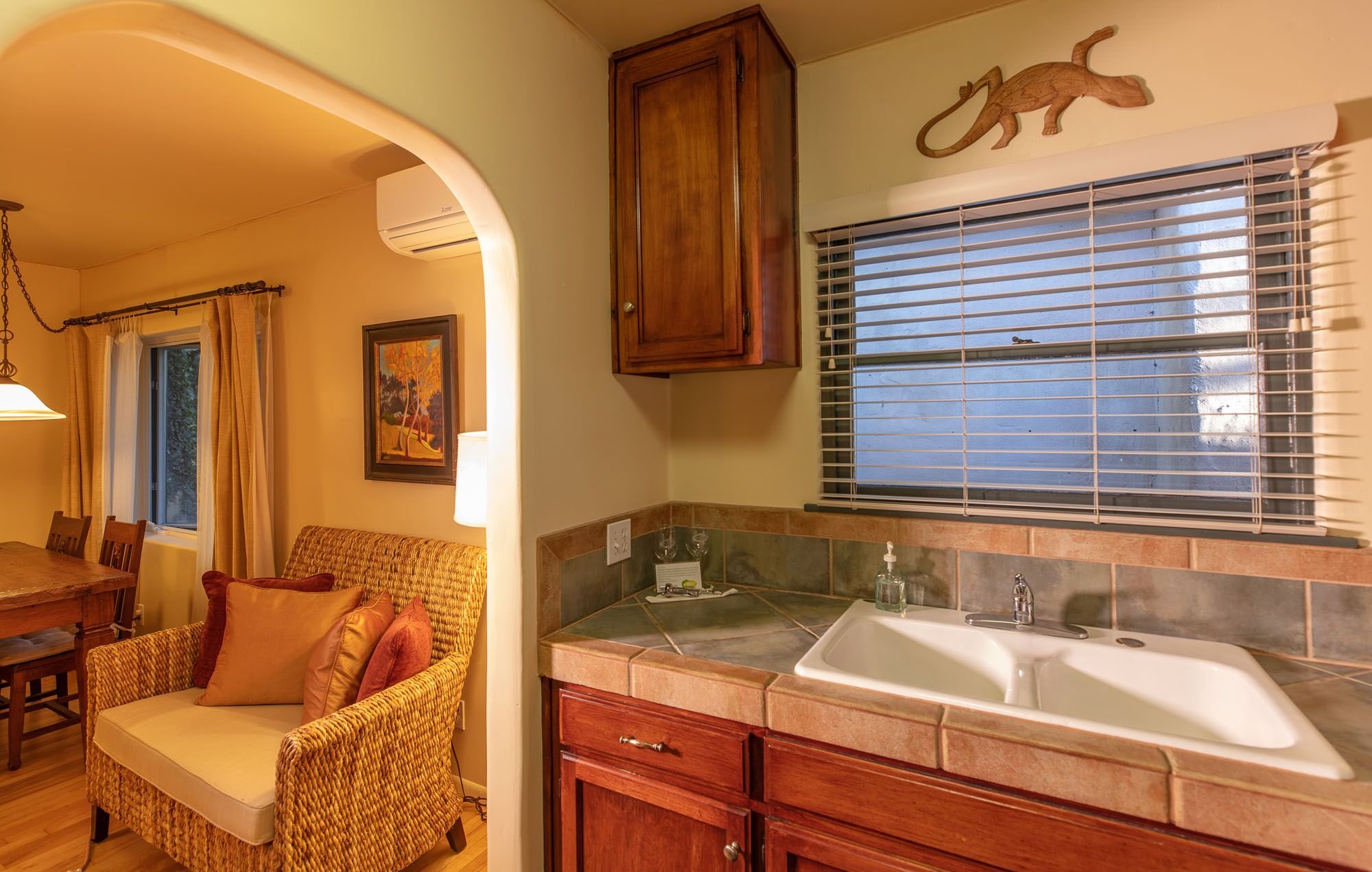 A gracious archway leads to a garden sitting area, then into the beautiful Leaf Suite. Hardwood floors and a spacious living room, accented with a dining table and fully equipped kitchen invite peace and comfort. The large bedroom includes two Queen Beds and a spacious full bath.s.