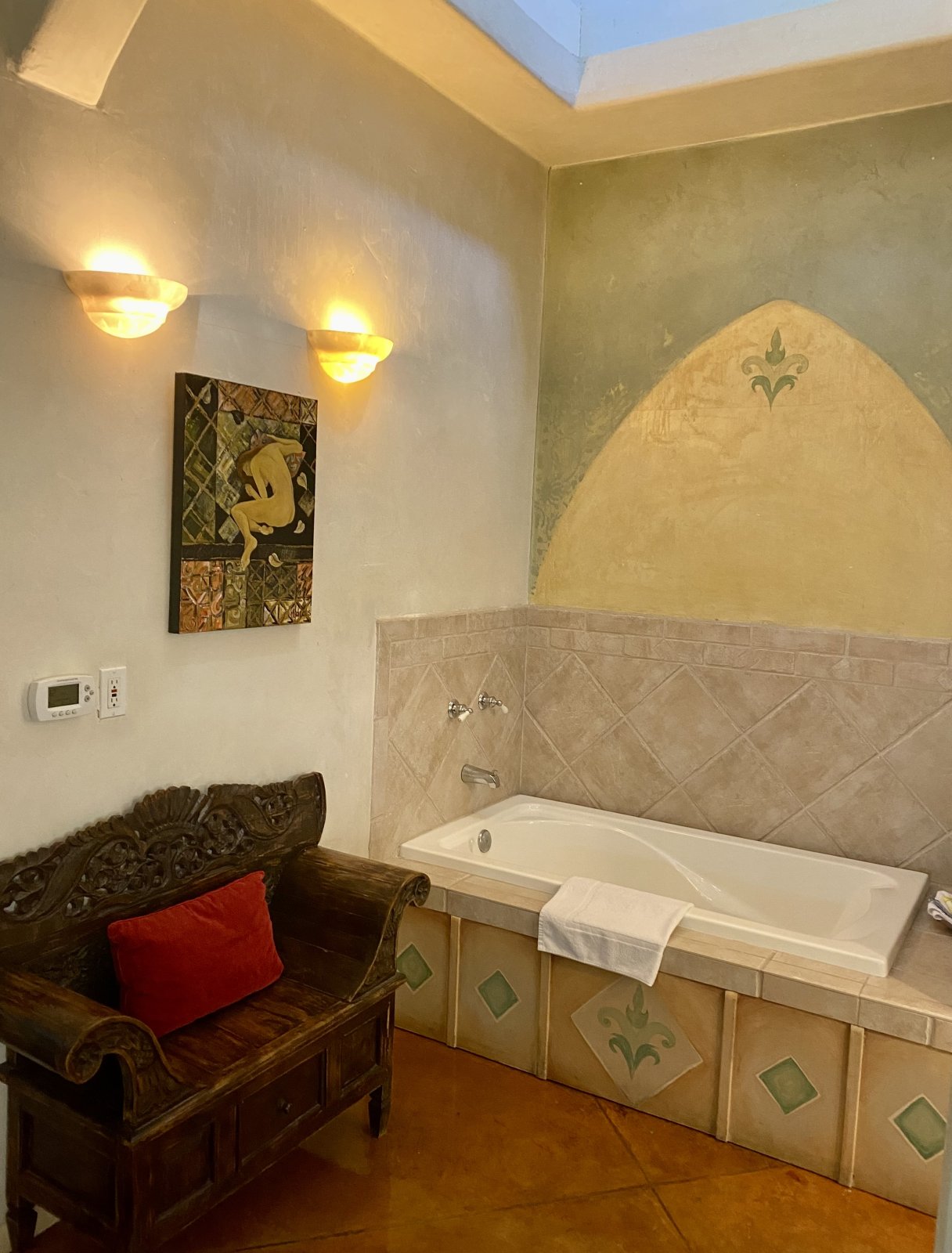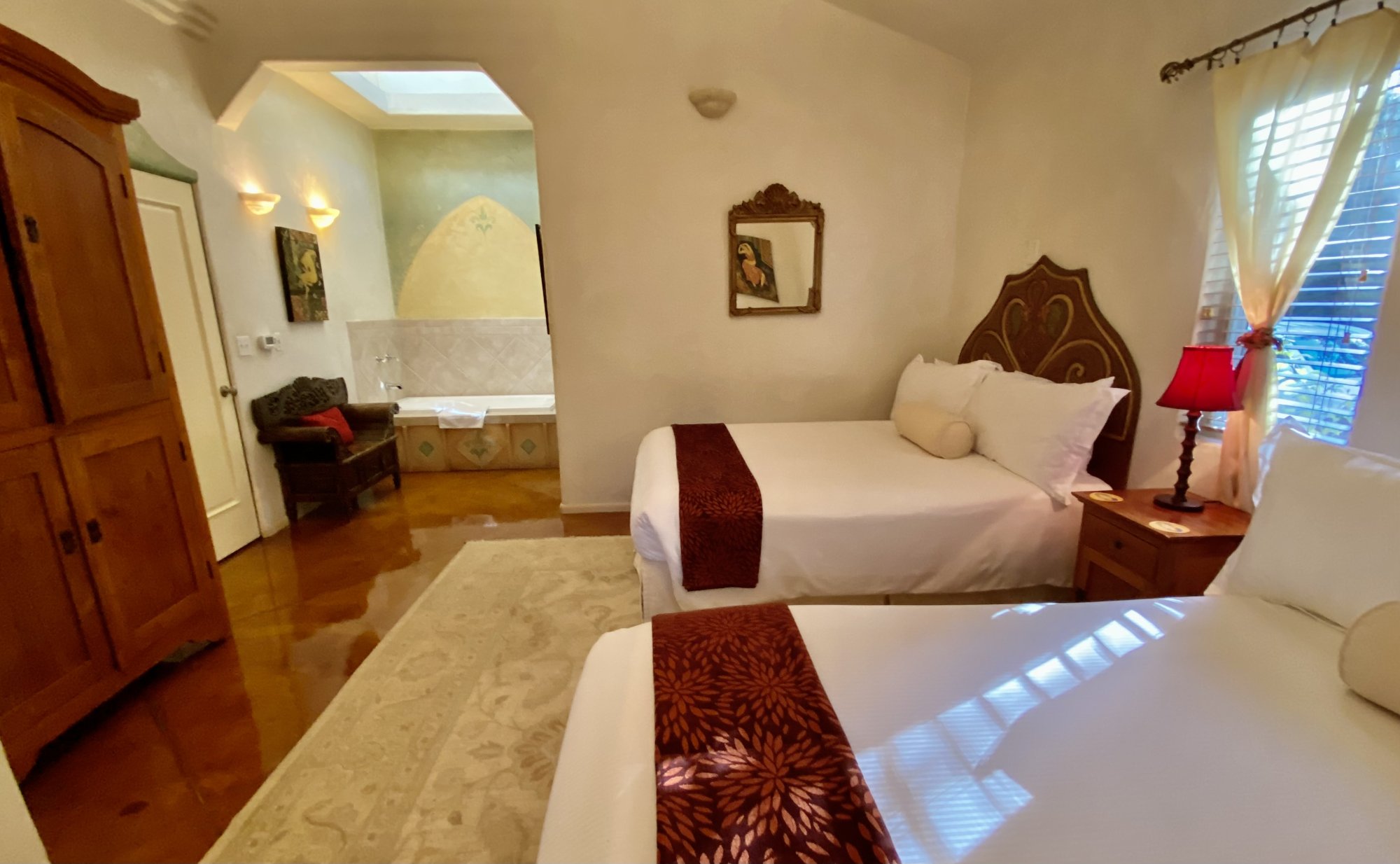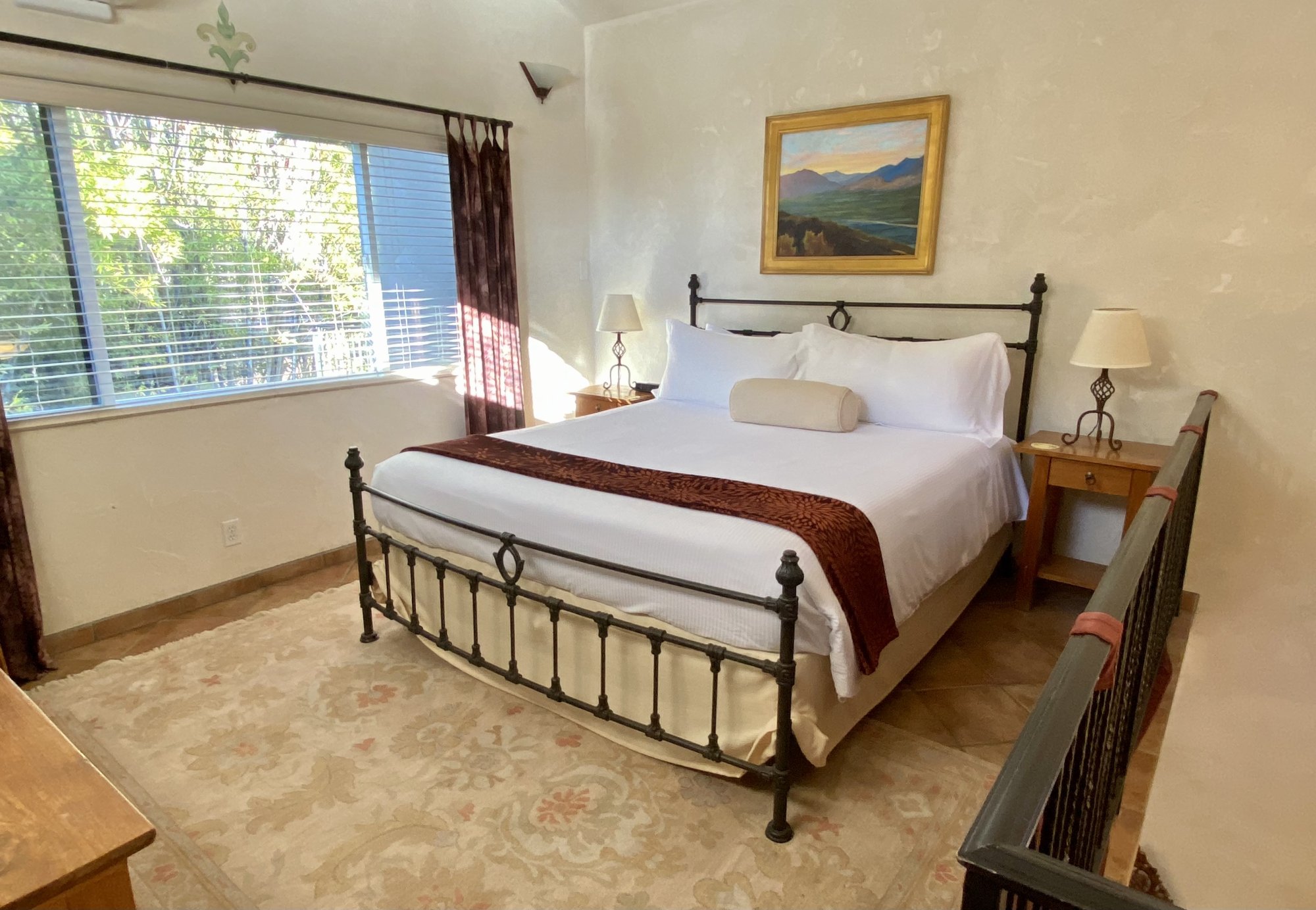 This cheerful 2 story suite is an exquisite accommodation. The cozy living room has a gas-burning wood stove fireplace, high vaulted ceilings, bath and a private garden patio off of the dining area. A sweeping spiral staircase leads to a spacious sleeping loft w/ a King bed. The separate downstairs bedroom has 2 Queen beds, another private bath, a luxurious whirlpool bathtub and two private courtyards.